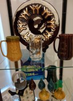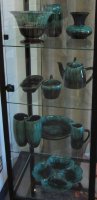 Certainly, the major contributor to this particular display, and understandingly so, is Céramique de Beauce (known as Beauceware in Ontario) with about one hundred individual pieces displayed. The most prolific child of a Government of Quebec initiative in 1939, it was designed to retain residents of the Beauce in that region year-round, particularly as the clay soils of that region were most suitable for pottery making. As well, the school that was set up to train potential potters was affiliated with the prestigious École du meuble de Montréal and the École des beaux-arts de Montréal, and it is considered that these were proponents of the Quebec version of the Arts and Crafts movement. Pierre-Aimé Normandeau, one of the founders of modern ceramics in Quebec was a major figure of the former and was instrumental in training and influencing numerous Quebec potters, for example, Jacques Garnier (see black satin ashtrays) and Raymond Lewis.